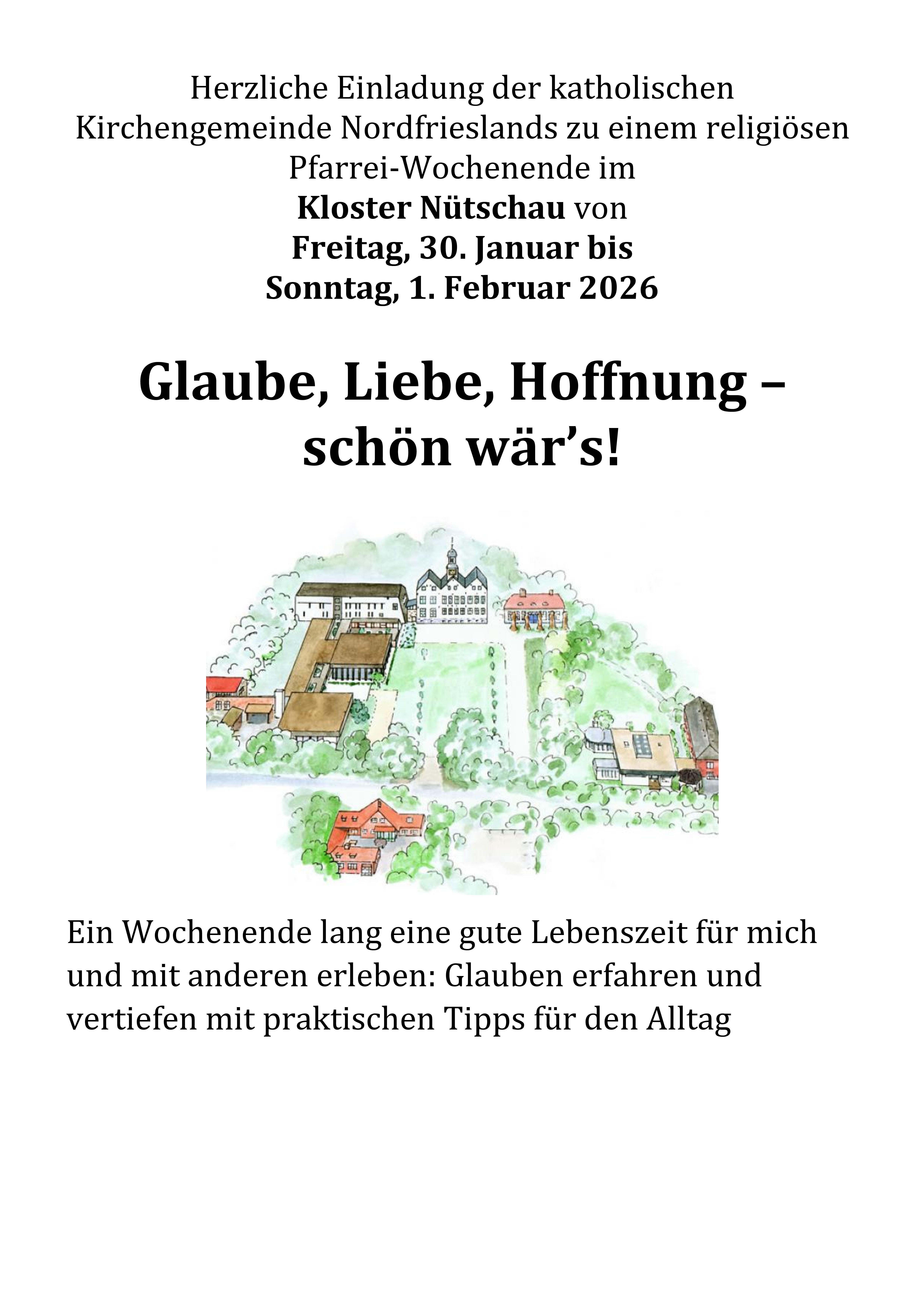Wie in den letzten Jahren bewährt, findet im Januar/Februar 2026 wieder ein gemeinsames Wochenende im Kloster Nütschau statt. Hierfür sind im Haus St. Ansgar 50 Plätze reserviert. Bekannte Menschen wiedertreffen, neue Menschen kennenlernen, am Klosterleben teilnehmen, Glauben ins Gespräch bringen, Glauben feiern, sich für den Alltag bereichern lassen, die gemeinsamen Mahlzeiten genießen und die Gespräche zwischendurch. Die inhaltliche Beschäftigung findet in Gruppen statt. Vorkenntnisse sind nicht erforderlich.